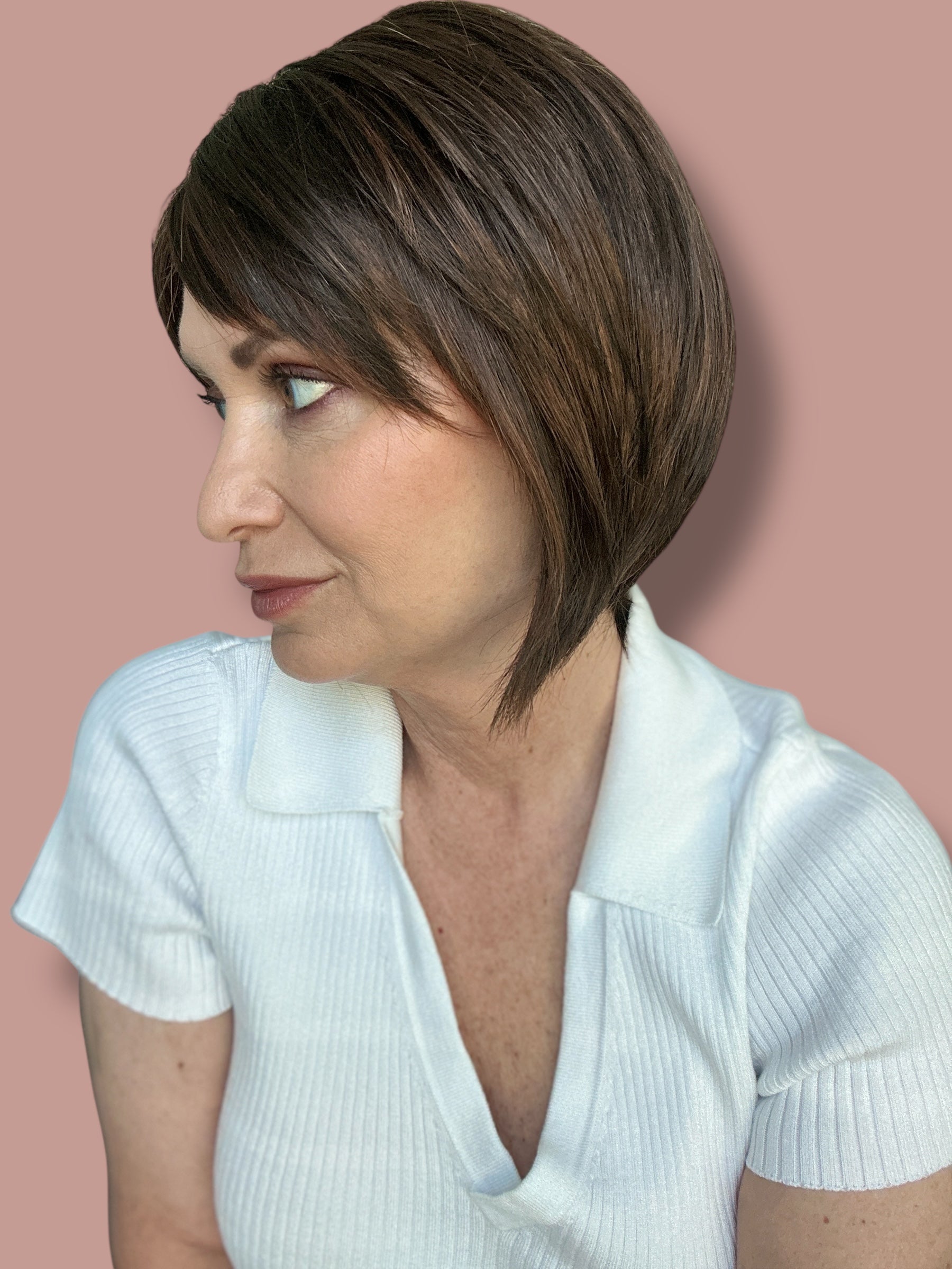 Ava is a modern cut from the high-energy Modixx Collection. Ava has an extended lace front and monofilament part that provides a natural hairline appearance, and a natural growth appearance in the parting area. Ava is slightly longer than chin length and offers stylish face-framing layers to create sleek or edgy looks