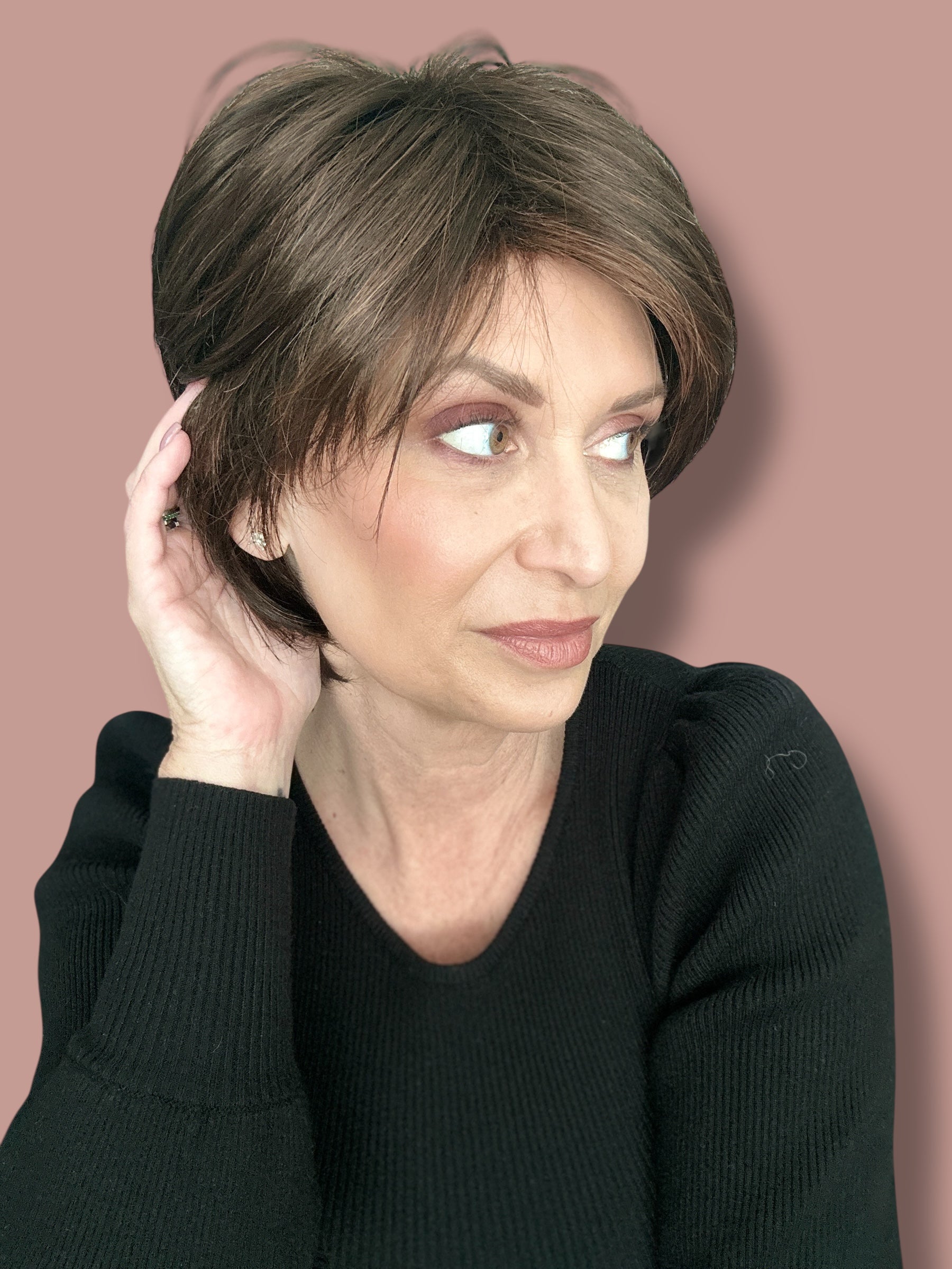 Sky by Noriko is a short, face flattering bob with feathered layers, wispy ends and swept side bang. The open wefts cap construction allows for an airy cool design which is lightweight and ideal everyday wear. Wefted caps adapt very well to the shape of the head and allow air to circulate. Made with a permatease top which is a teasing, short haired, crimping effect on the roots to create more lift and volume.